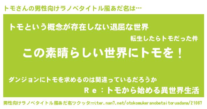 | 女子向けラノベタイトル風あだ名 | 『悪役トモに転生したようですが、知った事ではありません』 |