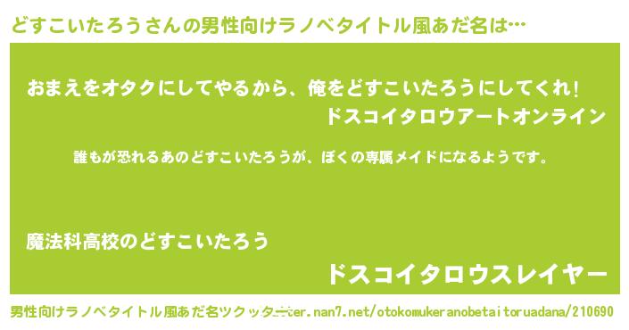 | 女子向けラノベタイトル風あだ名 | 『異世界でカフェどすこいたろうを開店しました。』 |