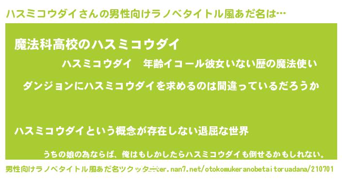 | 女子向けラノベタイトル風あだ名 | 『ハスミコウダイの卵を拾いまして』 |