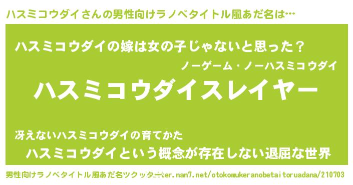 | 女子向けラノベタイトル風あだ名 | 『婚約破棄系悪役ハスミコウダイに転生したので、保身に走りました。』 |