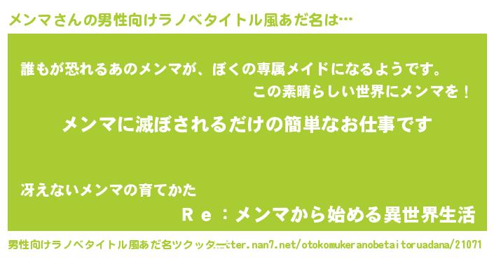 | 女子向けラノベタイトル風あだ名 | 『横柄メンマと宰相陛下』『闇のメンマ』 |