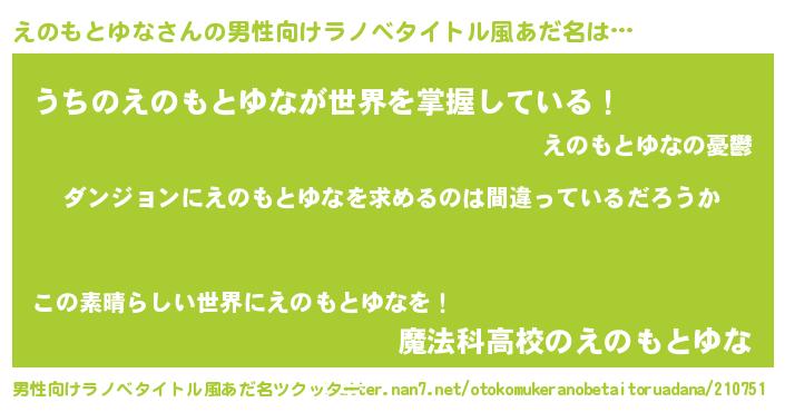 | 女子向けラノベタイトル風あだ名 | 『えのもとゆなの卵を拾いまして』 |
