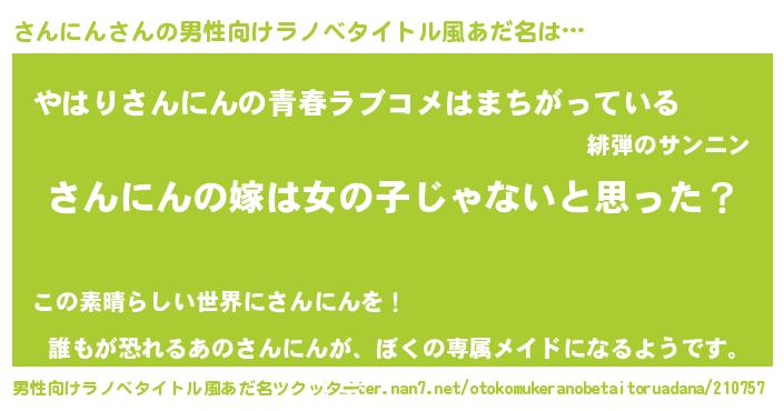 | 女子向けラノベタイトル風あだ名 | 『さんにんの卵を拾いまして』 |