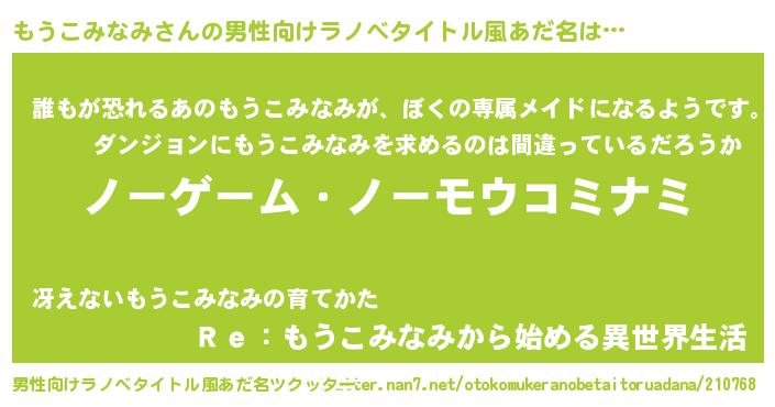 | 女子向けラノベタイトル風あだ名 | 『死神もうこみなみの再婚』 |