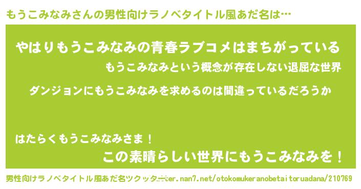 | 女子向けラノベタイトル風あだ名 | 『もうこみなみは平凡を望む』 |