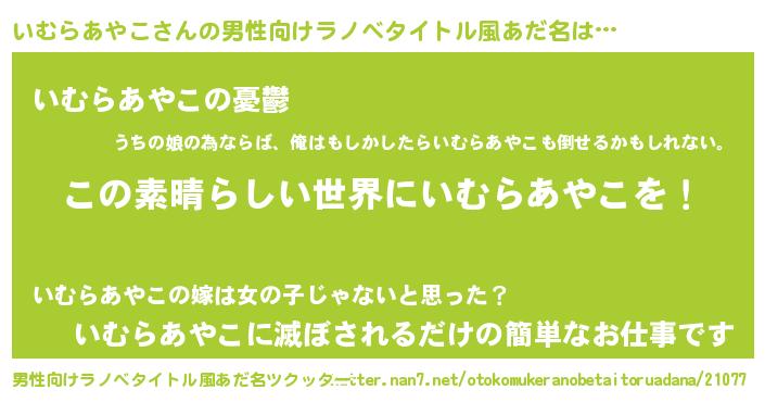 | 女子向けラノベタイトル風あだ名 | 『乙女ゲームの破滅フラグしかない悪役いむらあやこに転生してしまった…』 |