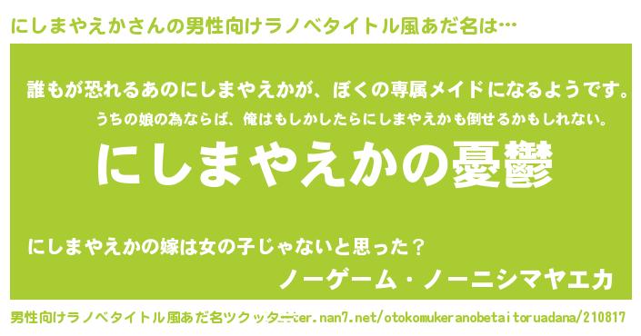 | 女子向けラノベタイトル風あだ名 | 『(仮)にしまやえかのやんごとなき事情』 |
