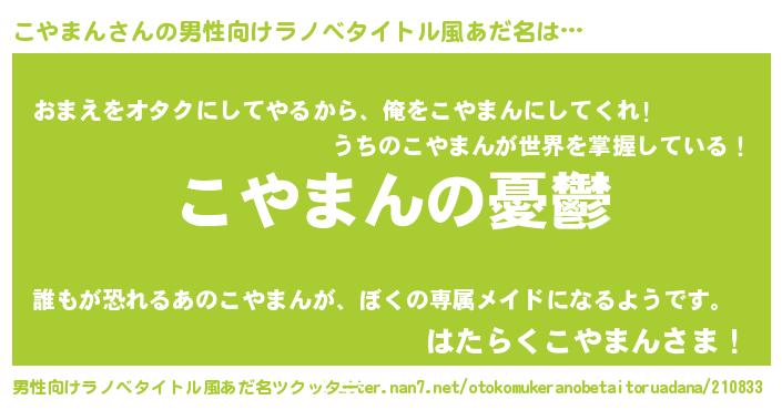 | 女子向けラノベタイトル風あだ名 | 『(仮)こやまんのやんごとなき事情』 |