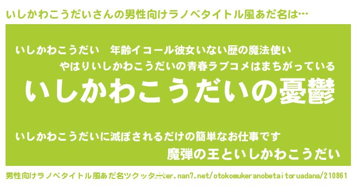 | 女子向けラノベタイトル風あだ名 | 『(仮)いしかわこうだいのやんごとなき事情』 |
