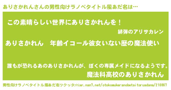 | 女子向けラノベタイトル風あだ名 | 『ありさかれんの玉の輿計画!』 |