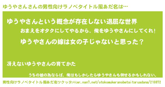 | 女子向けラノベタイトル風あだ名 | 『ゆうやさん様がみてる』 |