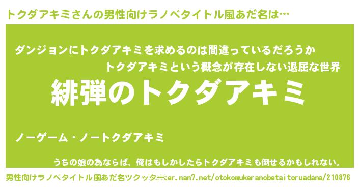 | ヒーロー風カッコイイあだ名 | 『暗黒騎士トク』『ネオトクダアキミ』 |