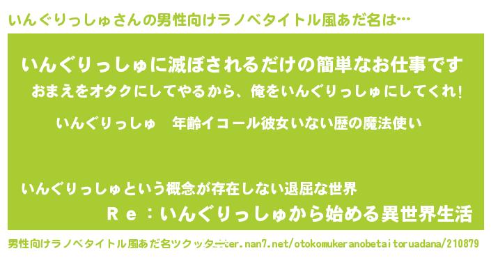 | 伝説のあだ名 | 『救世主となる錬金術士いんぐりっしゅ』 |