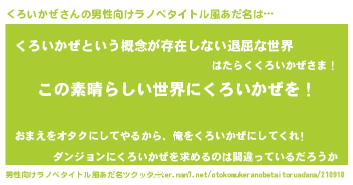 | 胡散臭い通販商品みたいなあだ名 | 『あなたにだけ特別に提供する限定10本のレアな日本酒…その名も「くろいかぜ」』 |