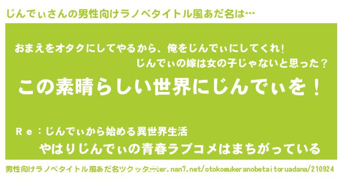 | 女子向けラノベタイトル風あだ名 | 『悪役じんでぃに転生したようですが、知った事ではありません』 |