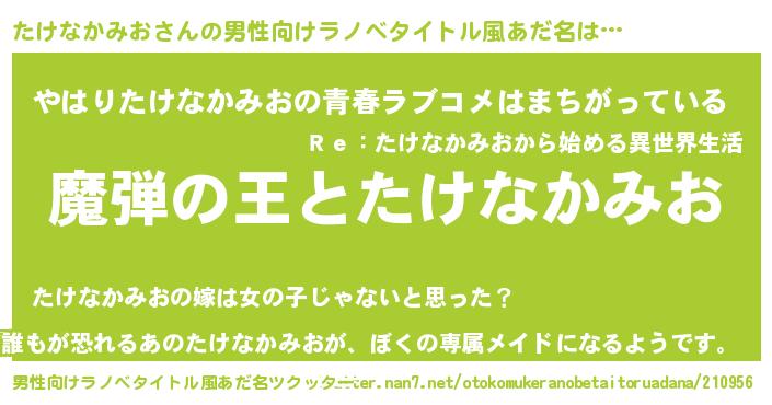 | 女子向けラノベタイトル風あだ名 | 『たけなかみおが死なない童話 林檎のたけなかみおの診療簿』 |