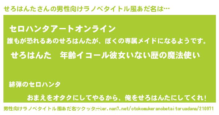 | 女子向けラノベタイトル風あだ名 | 『せろはんたの玉の輿計画!』 |