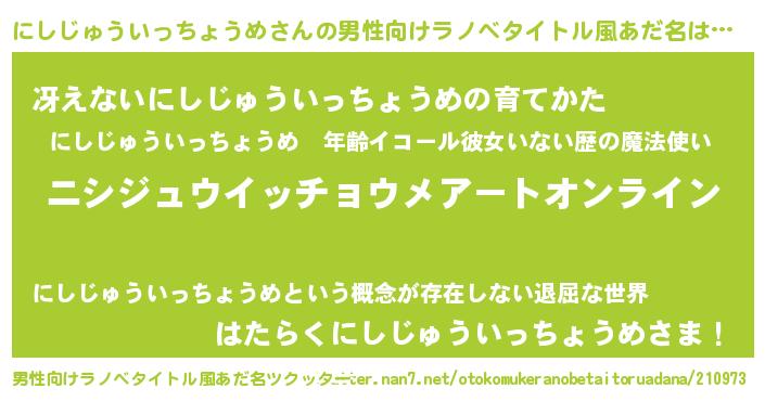 | 女子向けラノベタイトル風あだ名 | 『誰かこのにしじゅういっちょうめを説明してください! ~契約から始まるウェディング~』 |