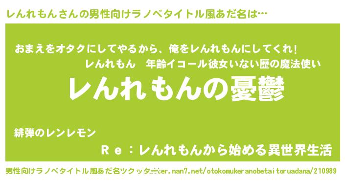 | 女子向けラノベタイトル風あだ名 | 『(仮)レんれもんのやんごとなき事情』 |