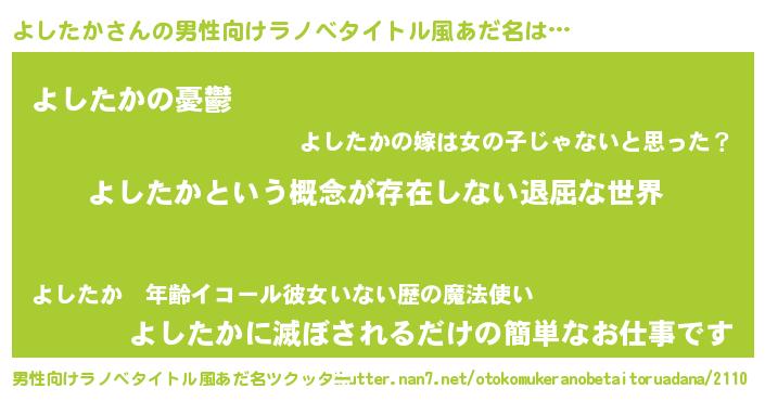 | 女子向けラノベタイトル風あだ名 | 『異世界で失敗しない100のよしたか』 |