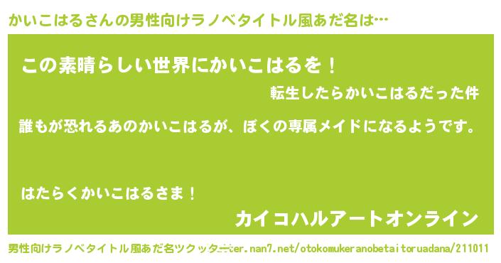 | 胡散臭い通販商品みたいなあだ名 | 『来世でも幸せになれる水素水…その名も「かいこはる」』 |