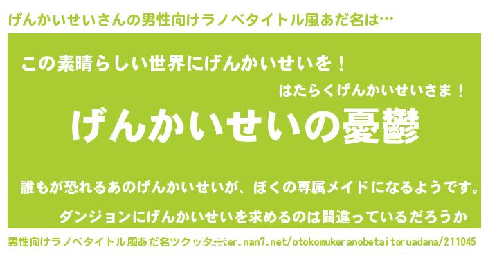 | 女子向けラノベタイトル風あだ名 | 『(仮)げんかいせいのやんごとなき事情』 |