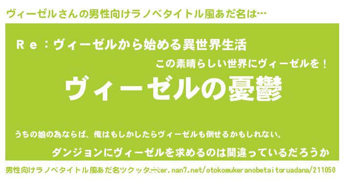 | 女子向けラノベタイトル風あだ名 | 『(仮)ヴィーゼルのやんごとなき事情』 |