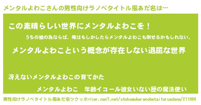 | 女子向けラノベタイトル風あだ名 | 『異世界で失敗しない100のメンタルよわこ』 |