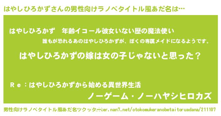| 女子向けラノベタイトル風あだ名 | 『はやしひろかず様がみてる』 |