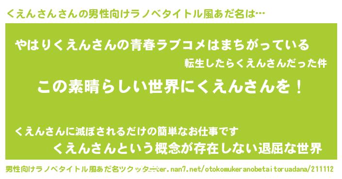| 女子向けラノベタイトル風あだ名 | 『悪役くえんさんに転生したようですが、知った事ではありません』 |