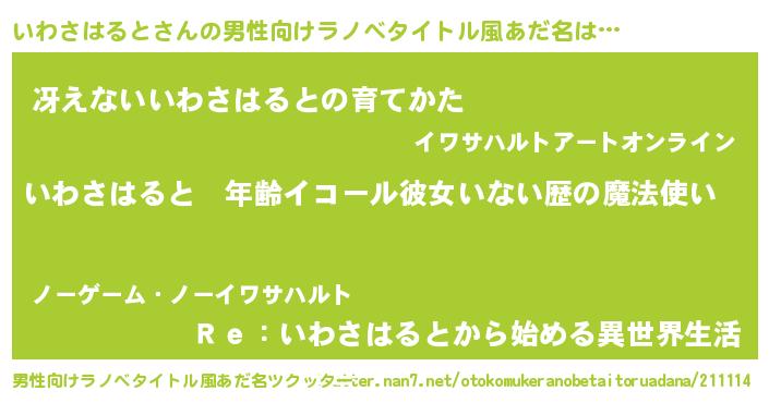 | 女子向けラノベタイトル風あだ名 | 『いわさはるとの玉の輿計画!』 |
