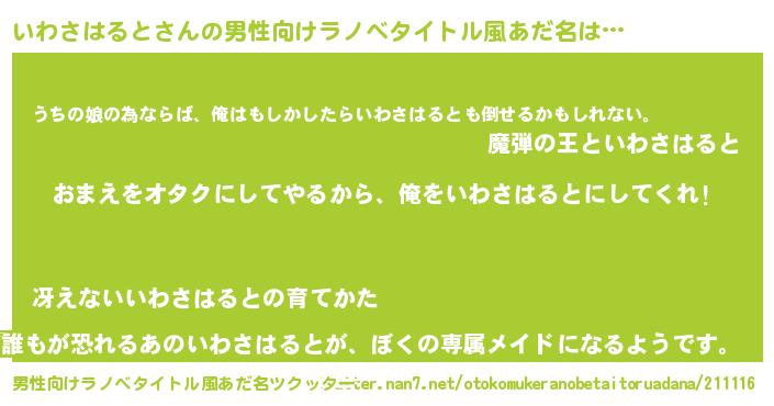 | 女子向けラノベタイトル風あだ名 | 『いわさはると夫妻のなれそめ』 |
