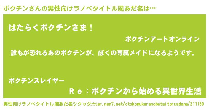 | 女子向けラノベタイトル風あだ名 | 『異世界でカフェボクチンを開店しました。』 |