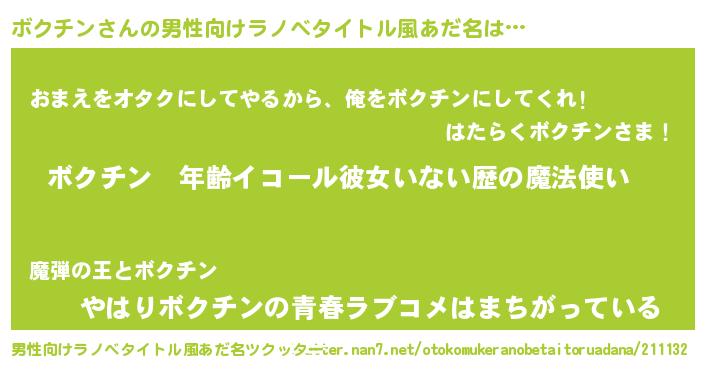 | 女子向けラノベタイトル風あだ名 | 『ボクチンの玉の輿計画!』 |