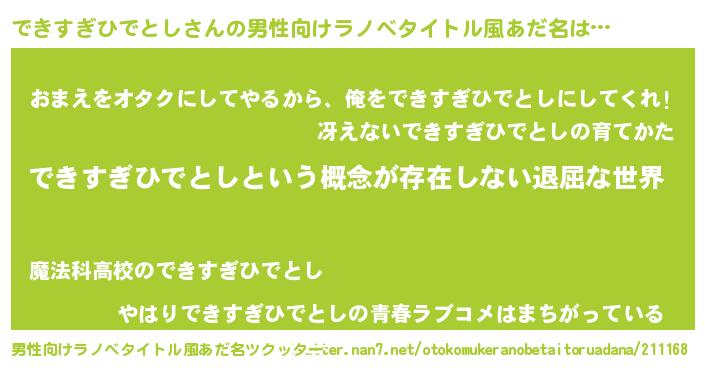 | 女子向けラノベタイトル風あだ名 | 『異世界で失敗しない100のできすぎひでとし』 |