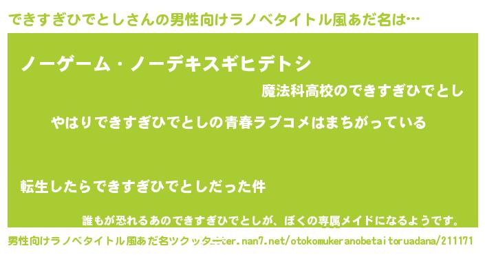 | 女子向けラノベタイトル風あだ名 | 『できすぎひでとし伯爵の花嫁』 |