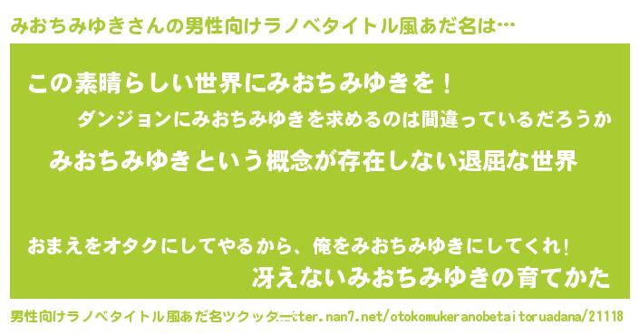 | 胡散臭い通販商品みたいなあだ名 | 『絶対に幸福をもたらす水素水…その名も「みおちみゆき」』 |
