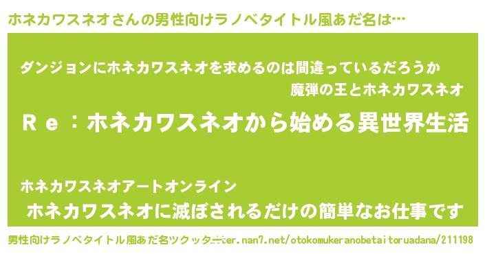 | 女子向けラノベタイトル風あだ名 | 『闇のホネカワスネオ』 |