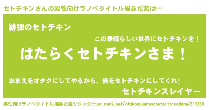 | ヒーロー風カッコイイあだ名 | 『仮面セトダー』『正義の使者セトチキン』 |