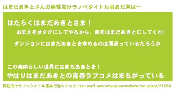 | 女子向けラノベタイトル風あだ名 | 『はまだあきとの卵を拾いまして』 |