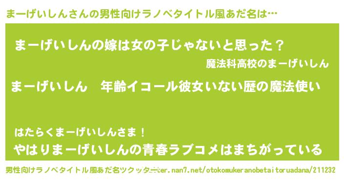 | 女子向けラノベタイトル風あだ名 | 『まーげいしんの玉の輿計画!』 |