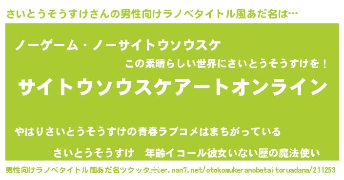 | 女子向けラノベタイトル風あだ名 | 『誰かこのさいとうそうすけを説明してください! ~契約から始まるウェディング~』 |
