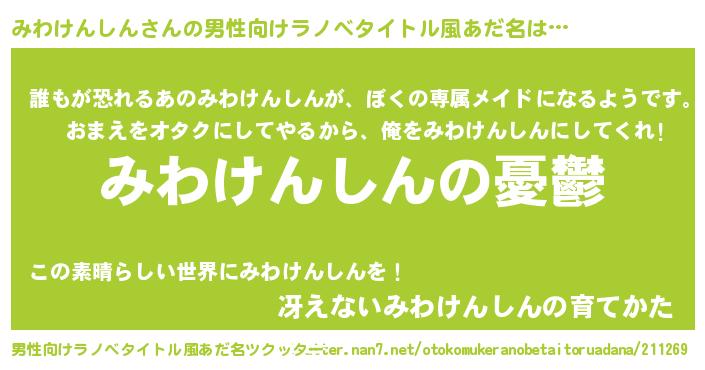 | 女子向けラノベタイトル風あだ名 | 『(仮)みわけんしんのやんごとなき事情』 |