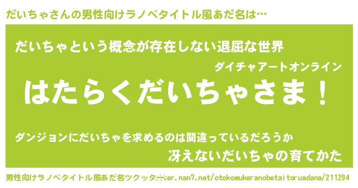 | 胡散臭い通販商品みたいなあだ名 | 『来世でも幸せになれる水素水…その名も「だいちゃ」』 |