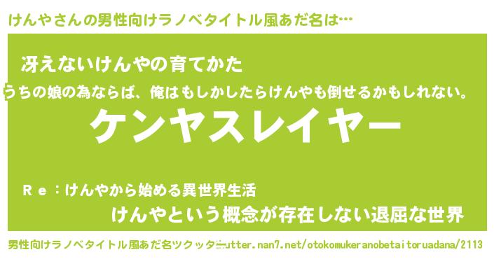 | 胡散臭い通販商品みたいなあだ名 | 『絶対に幸福をもたらす水素水…その名も「けんや」』 |