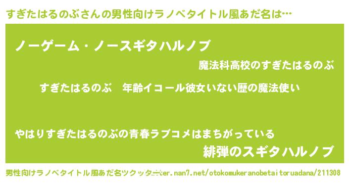 | 女子向けラノベタイトル風あだ名 | 『すぎたはるのぶの玉の輿計画!』 |