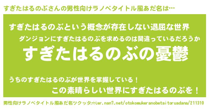 | 女子向けラノベタイトル風あだ名 | 『(仮)すぎたはるのぶのやんごとなき事情』 |