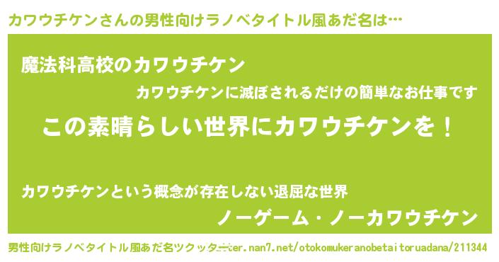 | 女子向けラノベタイトル風あだ名 | 『悪役カワウチケンに転生したようですが、知った事ではありません』 |