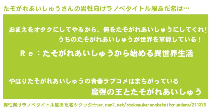 | 女子向けラノベタイトル風あだ名 | 『たそがれあいしゅうストレイドッグス』 |