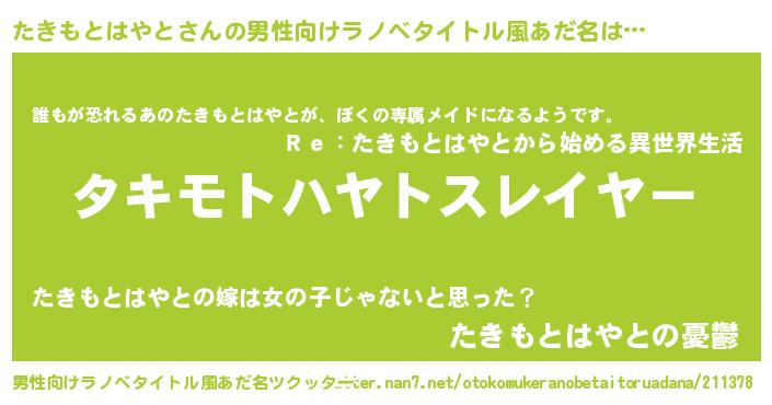| 女子向けラノベタイトル風あだ名 | 『婚約破棄系悪役たきもとはやとに転生したので、保身に走りました。』 |